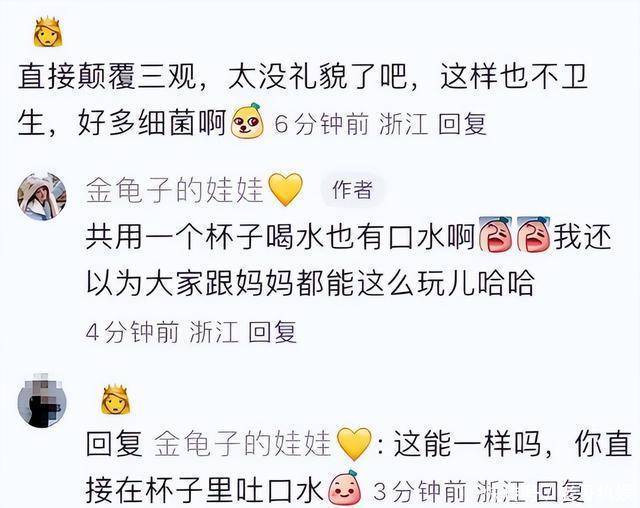 三岁小孩这么玩,尚可以理解,当父母的忍忍也就罢了,可她都结婚生娃,是一个孩子的妈妈了,却对自己亲妈做出这种不讲卫生,没有素质的事情。 很多人看到后再评论区指责她,可金龟子的态度依旧是包容,她虽然有些不情愿,可女儿一再催她尝尝,她还是喝了一口。